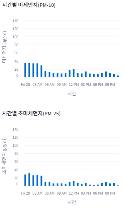 - 시간대 별 미세먼지 및 초미세먼지 : 선택된 날짜를 기준으로 선택한 지역구의 시간대 별 미세먼지 및 초미세먼지 농도를 시각화합니다. 이 그래프는 특정 시간대에 미세먼지 및 초미세먼지 농도가 어떻게 변동하는지를 보여주며, 사용자가 대기질 변화를 쉽게 파악할 수 있도록 합니다.