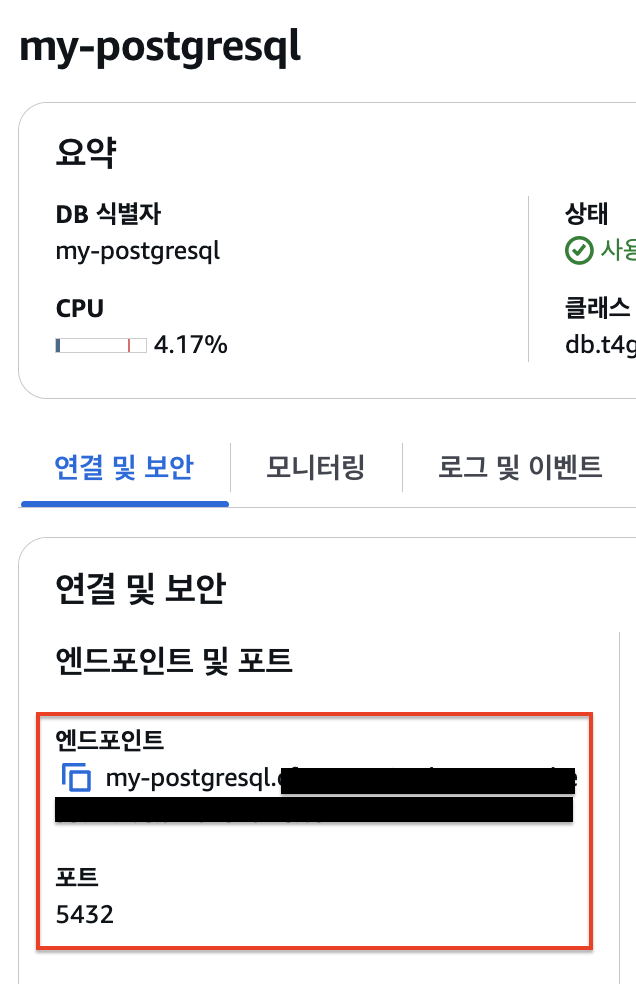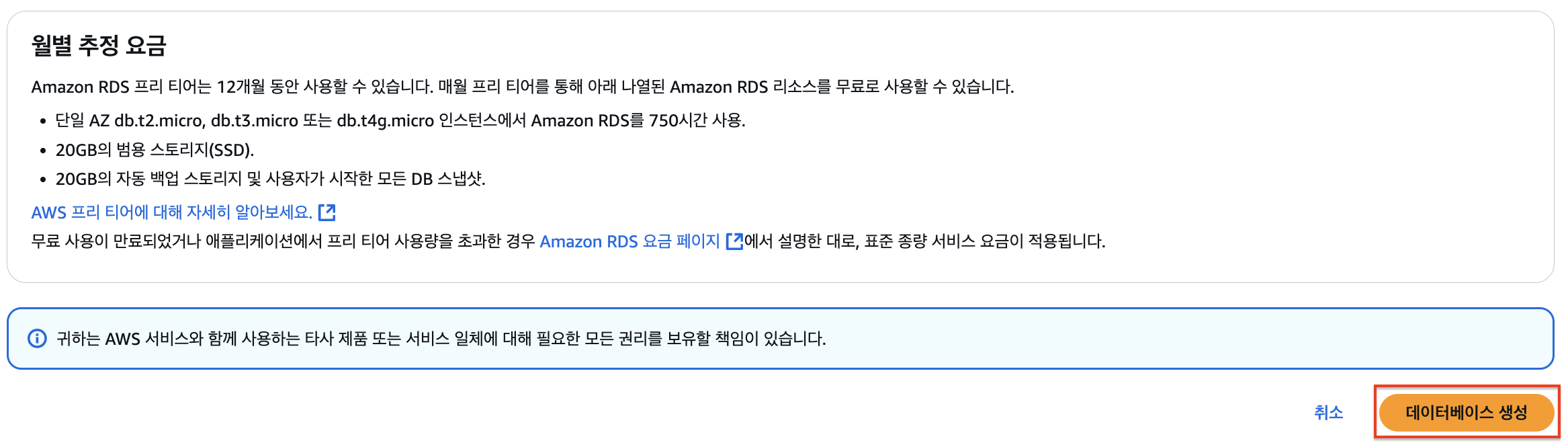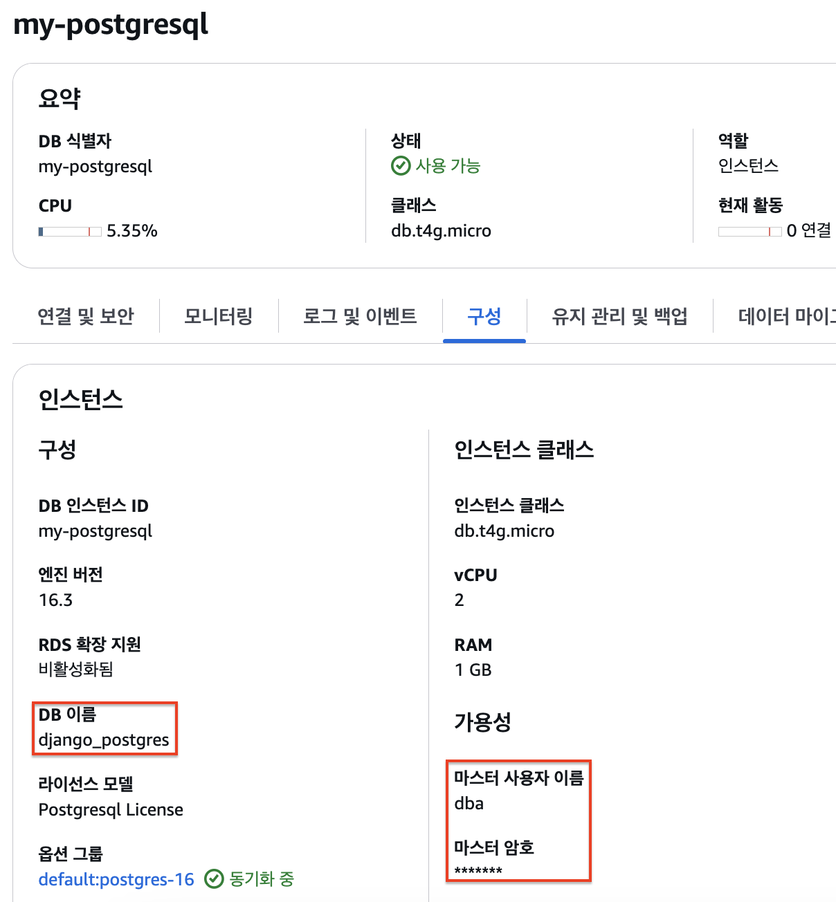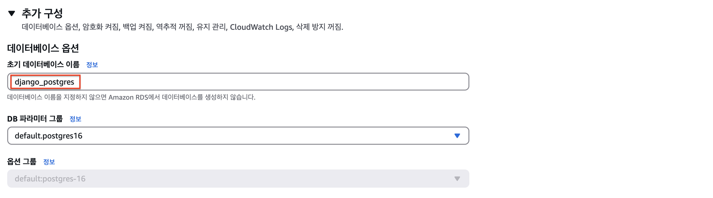 - 구성에서 DB 이름과, 마스터 사용자 이름, 마스터 암호