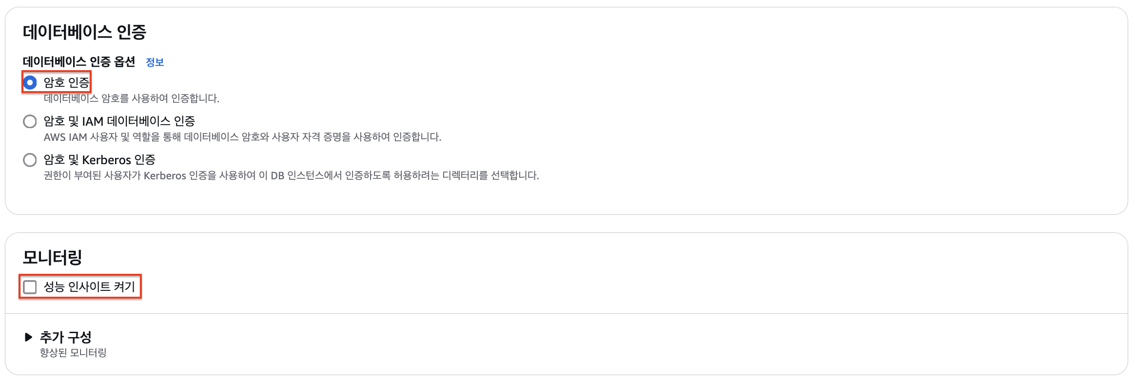 데이터베이스 인증은 암호 인증 방식으로 선택, 모니터링은 따로 안켜도 됨