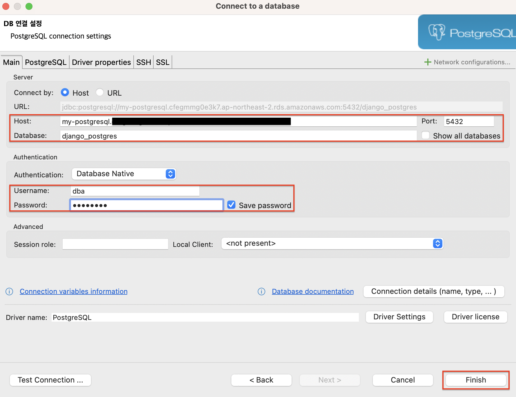 확인한 정보를 DB 연결 설정에 입력하고 연결